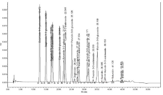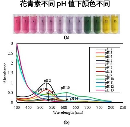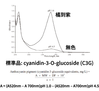 市面上有些產品標榜以國際公定分析化學家協會(AOAC)所開發的 UV 法檢測花青素濃度,即花青素在不同 pH 值下,呈現不同顏色,在兩個 pH 值下就會產生顏色的變化,再利用光度計檢測數值的變化,即可推斷出花青素含量。